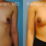 This 23 year old woman is 5'2" tall and weighs 130 pounds. She has no children. She presented as an A cup. She had a submuscular silicone implant placed through a peri-areolar incision. The implant is a 325 cc moderate profile. She is now a small C cup. The photo is taken 11 months after surgery.