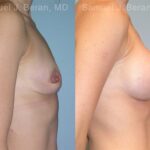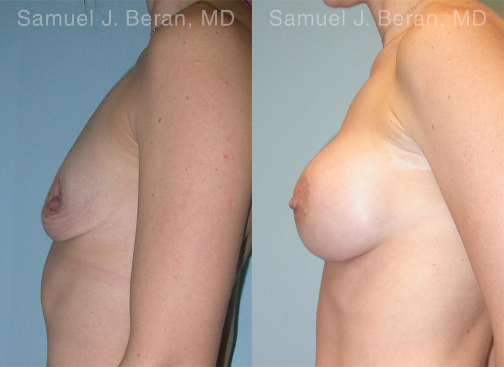 This 33 year old woman is 5'5" tall and weighs 120 pounds. She has 4 children and breast fed. Her bra size was an A cup. She had a submuscular silicone implant placed through an inframammary fold incision. The implant is a 375 cc high profile. She is now a small C cup. The photo is taken 6 months after surgery.