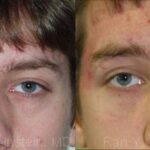 Left: After endoscopic brow lift to lift the droopy right eye brow.