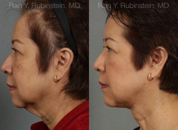 Before: pictures show a lax neck and jowl skin. Patient doesn’t want a full face lift due to cost, incisions, anesthesia and down time. A direct neck lift using a zig zag incision along the front of the neck heals with minimally visible scar. Procedure done under local anesthesia with only one week of downtime. Note this type of lift will not lift the cheeks (mid face). Patients can elect to have filler injections (fat, sculpra, juvederm, or radiesse) to lift the cheeks.