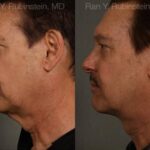 After: 10 months after a neck lift, utilizing the “Direct Neck Lift” approach where excess skin was removed from the front of the neck and the platysma (bands) tightened. This avoided the need for incisions in front and behind the ears which can be quite visible in men especially with short hair. The incision in the front of the neck is camouflaged by hiding it in the natural neck lines and by treating the scar with three Fraxel treatments starting 6 weeks after surgery. This type of neck lift can be done under local anesthesia with oral sedation. Recovery is only one week and the cost is about half of conventional neck and face lift surgery. Results are often superior to conventional neck lift surgeries as the problem, excess skin, is tackled at the sight of the problem rather than trying to pull that skin behind the ears. In order to further enhance his results, he had volume restoration to his jaw line and cheeks with Sculptra injections and the forehead lines with Botox and Juvederm injections.