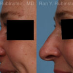 After: 1 month after injection of hyaluronic acid filler using a microcannula behind her bump and in front of the bump on her nose to camouflage the hump. In addition, the tip of her nose was filled to increase her tip projection and the muscle. See white arrows. She also had a neuromodulator injected into the muscle pulling her tip down. As you can see with smiling, her nose no longer gets pulled down. Our patient was thrilled, and nobody knew she had anything done as there was minimal downtime, and the results were so natural.